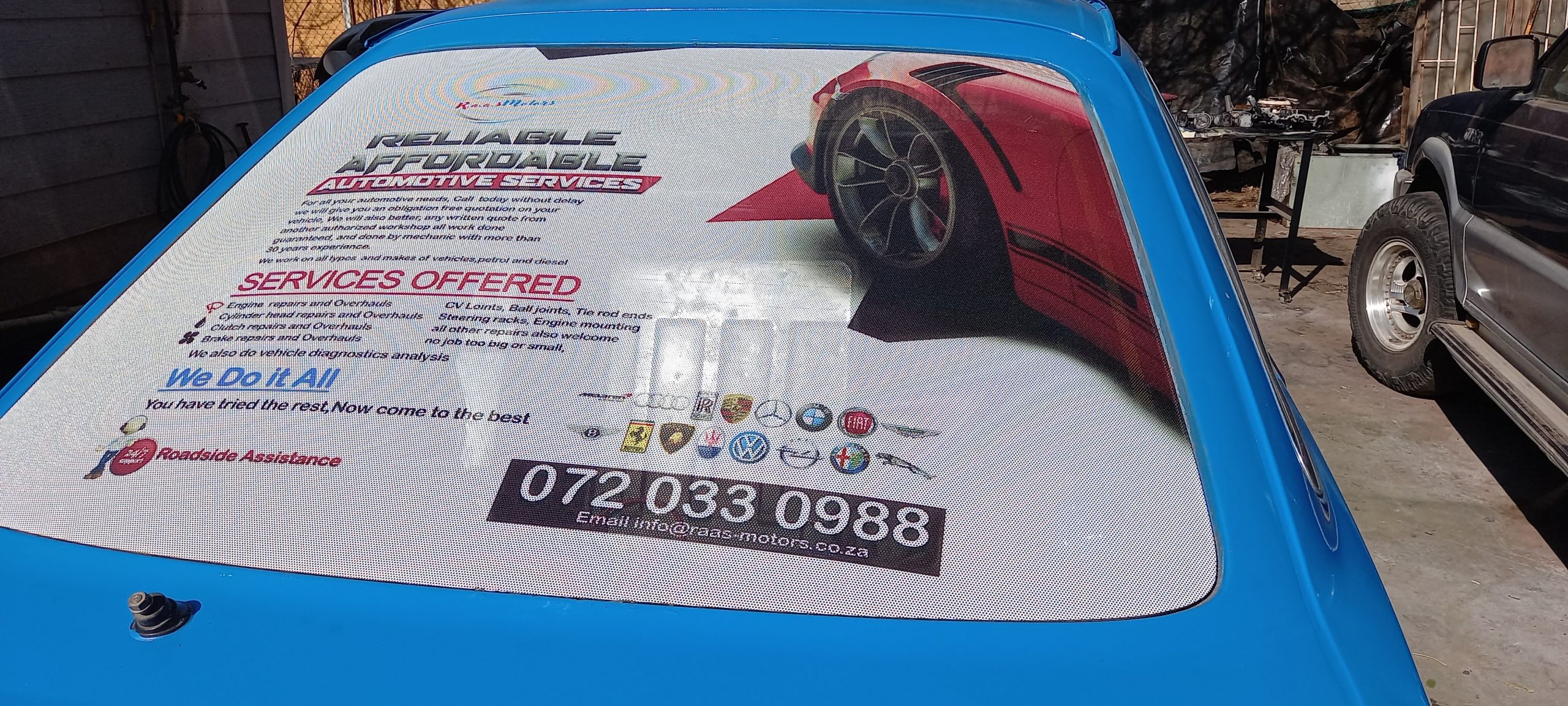 One way vision, full color print for rear window on standard vehicles (up to 1370mm x 800mm). Includes free installation.